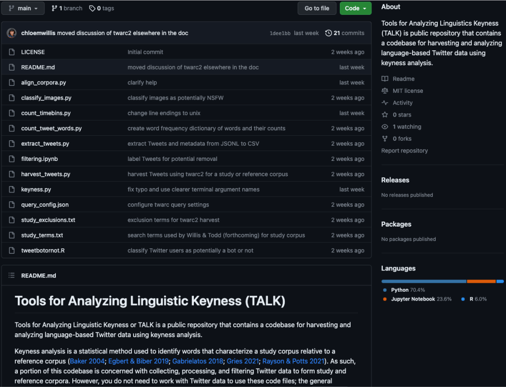 Tools for Analyzing Linguistic Keyness or TALK is a public repository that contains a codebase for harvesting and analyzing language-based Twitter data using keyness analysis. Keyness analysis is a statistical method used to identify words that indicate what a text (e.g. a Tweet) is about. The repository also includes resources for detecting bots and creating custom stopwords lists.