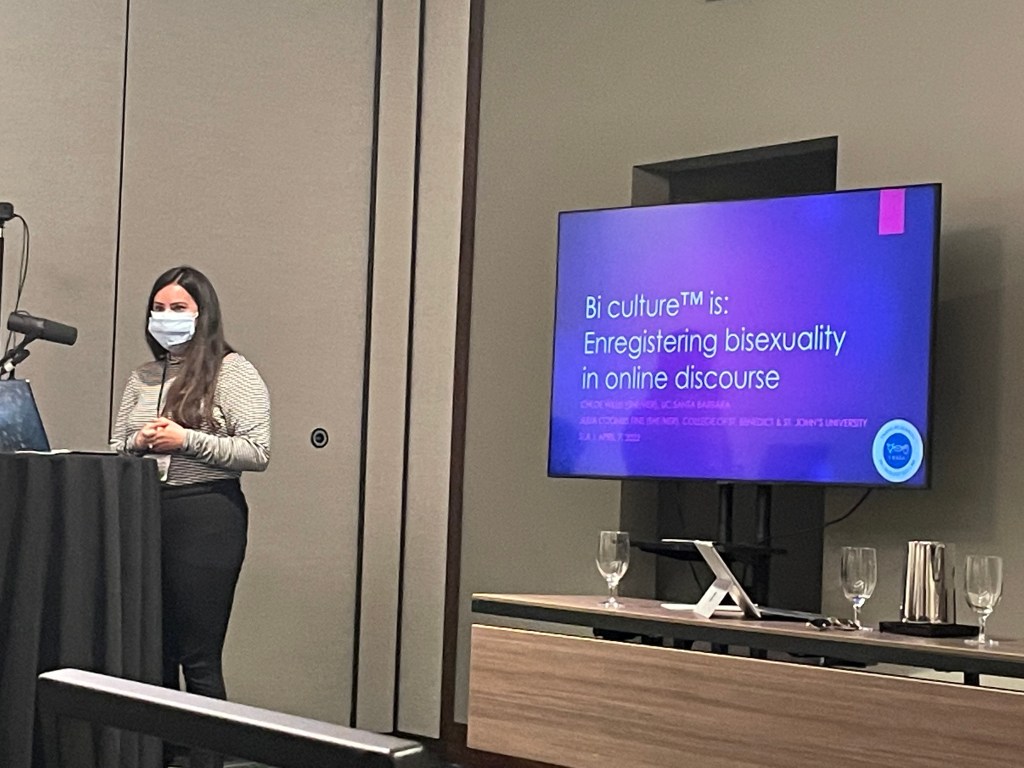 “Bi culture is…: Enregistering bisexuality in online discourse”. With Julia Fine. Spring Conference 2022, Society for Linguistic Anthropology. April 7, 2022. Boulder, CO. http://linguisticanthropology.org/blog/meetings/2020-spring-conference-society-linguistic-anthropology/.